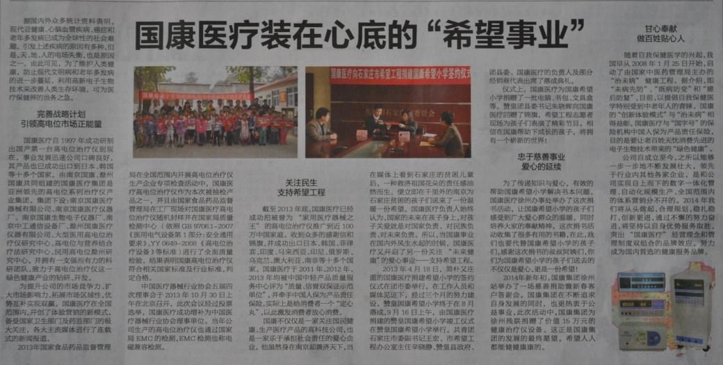 国康不仅仅是一家关注国民健康、生产医疗产品的高科技公司,也是一家乐于承担社会责任的爱心企业。他虽然身在南京却兼济天下,当在媒体上看到石家庄的贫困儿童后,一种救济祖国花朵的责任感油然而生,便立即在千里外的南京为石家庄贫困的孩子们送来了一份温暖一份希望。国康医疗负责人始终认为,国家的未来在孩子身上,对孩子关爱就是对国家负责、对民族负责、对未来负责。所以,当国康事业在国内外风生水起的时候,国康医疗又开启了另一份关注“未来健康”的爱心事业――支持希望工程。