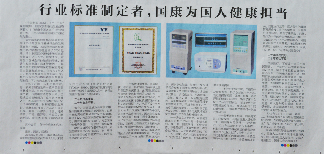 2016年7月29日,国家食品药品监督管理总局正式发布中华人民共和国医药行业标准《电位治疗设备YY0649-2016》,国康医疗受邀为高电位治疗仪标准主要起草人之一,这标志国康公司发展进入全新阶段。